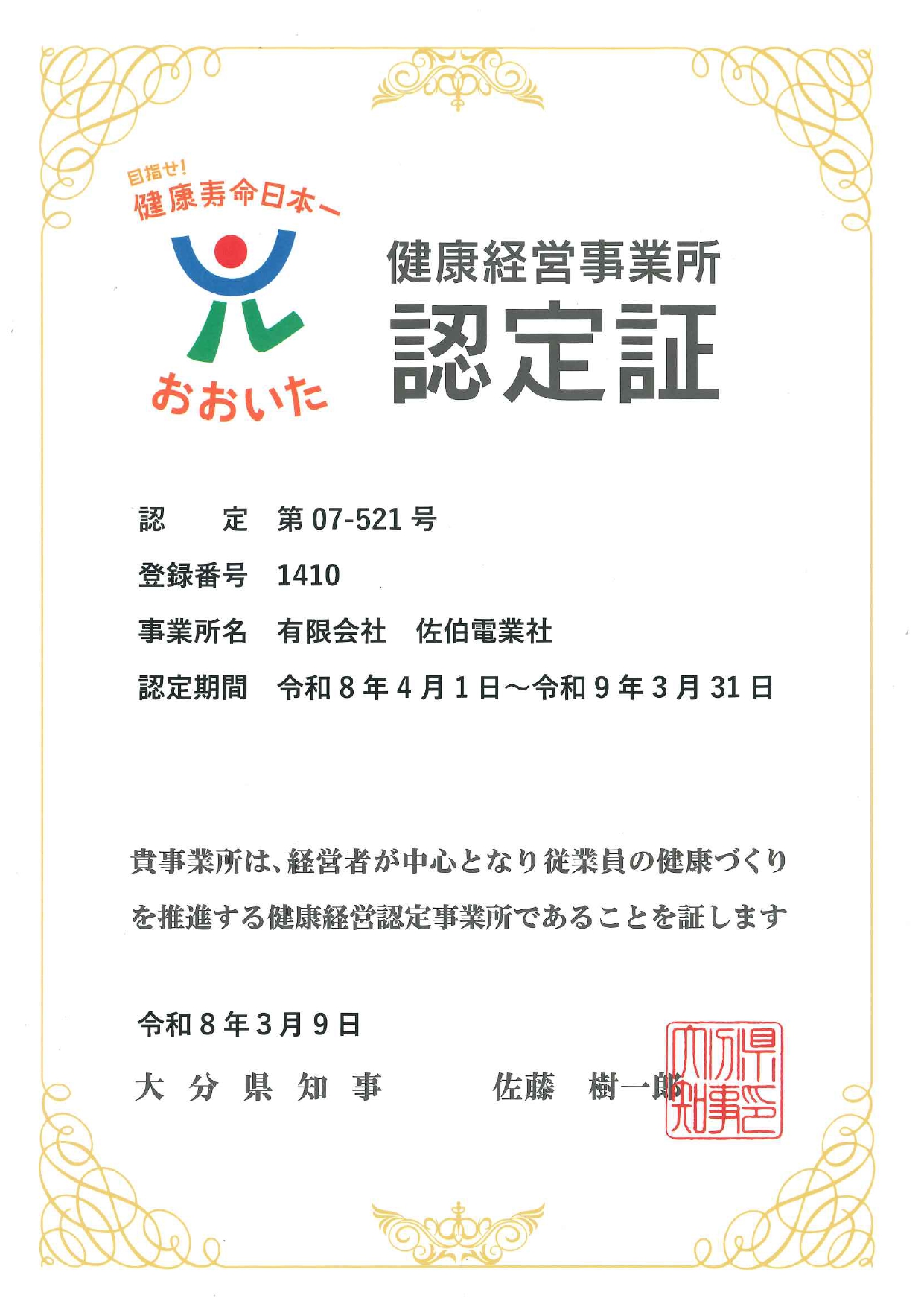 認定・表彰2026.03.24令和8年度「健康経営事業所」に認定されました 令和8年度「健康経営事業所」に認定されました ※これは大分県の認定制度で、大分県では、「健康経営とは、働く人の健康増進を会社の成長につなげようとする考え方」とし、事業所として従業員の健康づくりを積極的に実施することとし、その取り組みについて認定される制度です。 これからも、引き続き従業員の健康を支えていきたいと思います。 前の記事へ